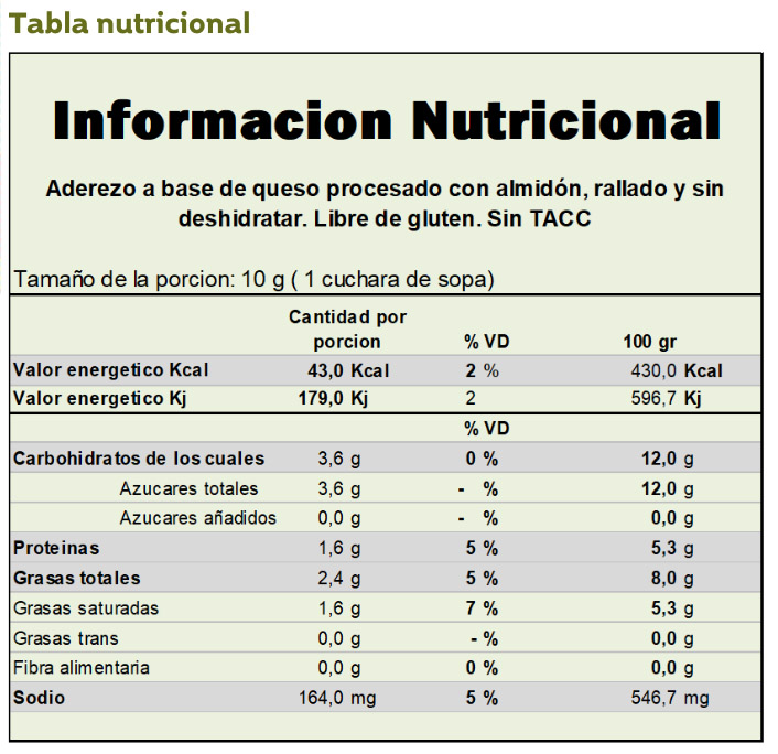 Aderezo a base de queso procesado con almidón, rallado y sin deshidratar. Libre de gluten. Sin TACC.