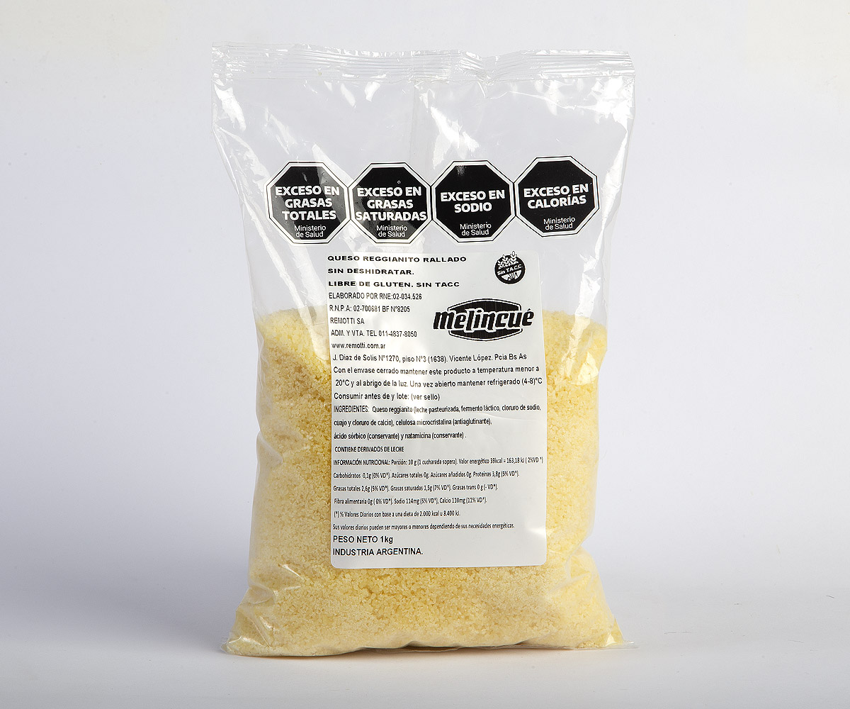Queso Reggianito rallado sin deshidratar. Libre de gluten. Sin TACC.